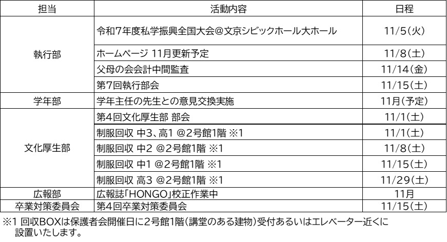 さて、執行部は11月15日(土)に第7回執行部会を実施予定です。11月は会計の中間監査や父母の会役員に関するアナウンスなど、来年度にむけての準備を進めてまいります。