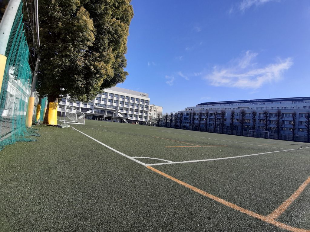 冬休みが終わり3学期が始まりました。学校は生徒たちのにぎやかな声が戻ってきました。また、この時期は冬晴れに2号館の白とグラウンドの緑がきれいです。